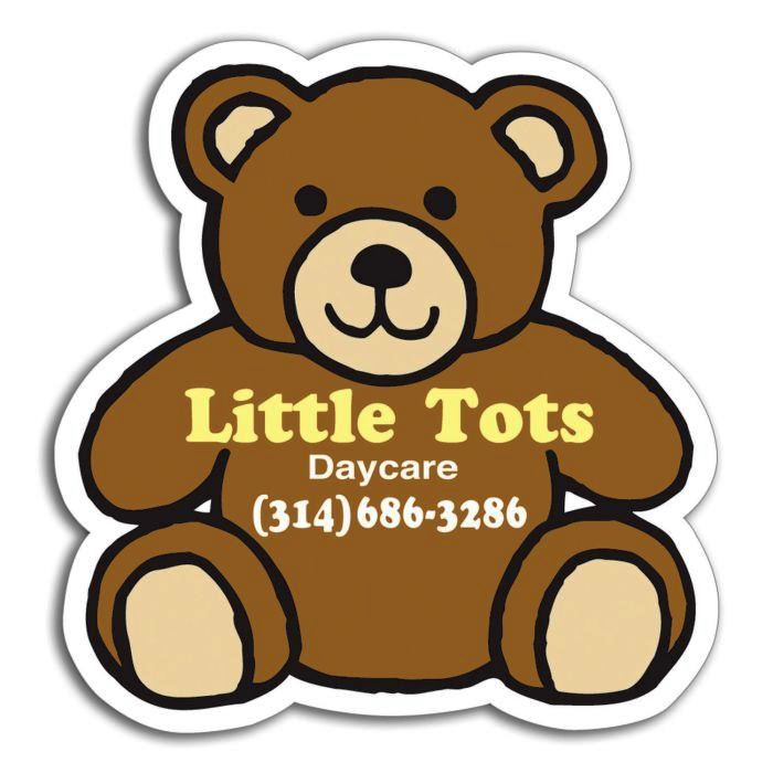 - Ideal for promoting care centers, family medical practices and toy stores, these teddy bear magnets measure 2 3/4 x 2 7/8. Always-in-stock and approximately 0.020 in thickness they can be customized with your company name, logo and specific message. The finished design makes for an eye-catching promotional product whether it's positioned on a filing cabinet or refrigerator. How can you bear not already having it in your collection?